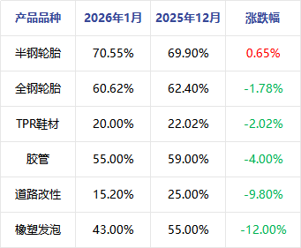 需求端表现看,据隆众样本数据跟踪,合成橡胶下游样本企业1月份开工多表现跌势,仅半钢轮胎呈现小幅提升局面。月内部分欧盟出口占比较大半钢胎企业外贸订单逐步上量,企业月内存提产现象,另有部分企业处于控产状态,导致半钢轮胎样本企业产能利用率提升幅度有限。全钢轮胎方面,月内处于季节性淡季,企业出货偏慢,整体库存储备高位,为控制库存增长,部分样本企业处于控产状态,拖拽产能利用率下行。其它制品行业开工环比均下跌,北方地区频繁环保政策、传统淡季因素等均影响样本企业开工。