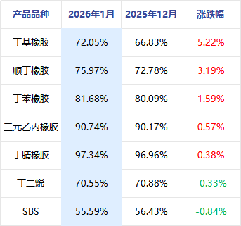 开工方面看,1月合成橡胶产业链产能利用率多表现提升,其中丁基橡胶、顺丁橡胶及丁苯橡胶产能利用率涨幅较高,仅上游原料丁二烯及SBS产品产能利用率出现下滑。