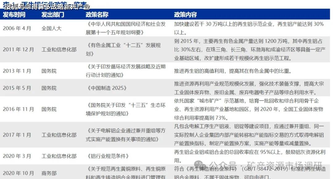 支持政策持续发布。在环境保护及节约能源背景推动下,循环经济逐渐发展成为我国重要的经济形式,自 2006 年“十一五”时期开启以来,全国人大、中央、国务院、发改委以及工业和信息化部针对再生资源综合利用颁布一系列政策,大力支持再生铝行业发展。随着再生铝产业规模化、装备技术现代化速度不断加快,再生铝有望替代电解铝成为我国铝消费的主要供应来源。“十一五”至“十四五”期间,我国涉及再生铝行业的国家政策大体上经历了四个演变发展阶段。